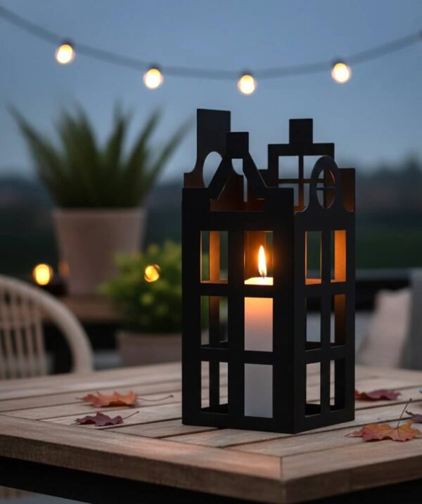 Plaats het windlicht op een stabiele ondergrond zoals een dressoir, vensterbank of eettafel. Zet er een grote kaars in en laat het zachte licht door de karakteristieke ramen schijnen. Zo creëer je in een handomdraai een warme, gezellige sfeer in huis – ideaal voor donkere avonden of feestelijke momenten.