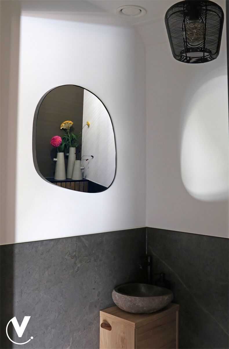 Dankzij de diepzwarte afwerking past de asymmetrische spiegel zwart perfect in zowel minimalistische als expressieve interieurs. Hij vormt een blikvanger in elke ruimte en brengt een vleugje kunstzinnige elegantie in je woning.